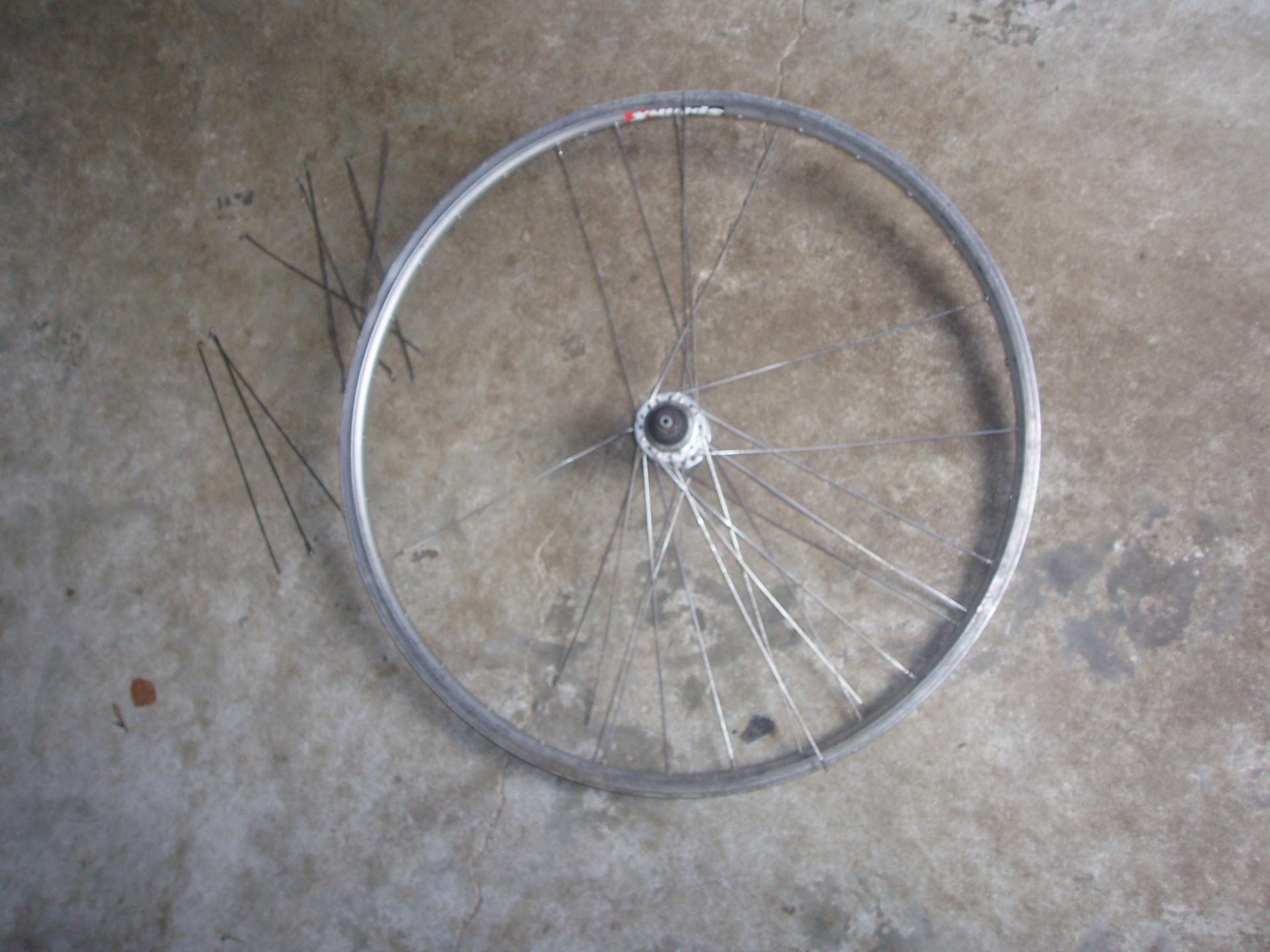 Roue arrière en cour de dévoilage, remontage des rayons.