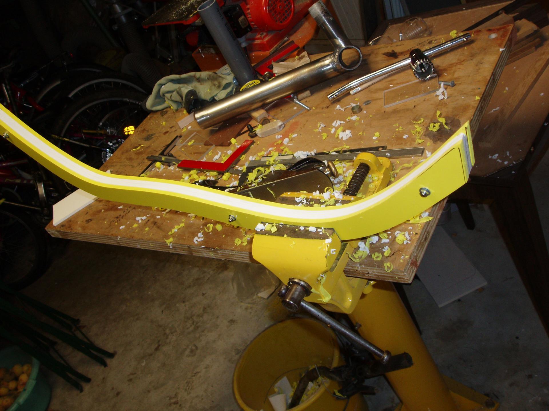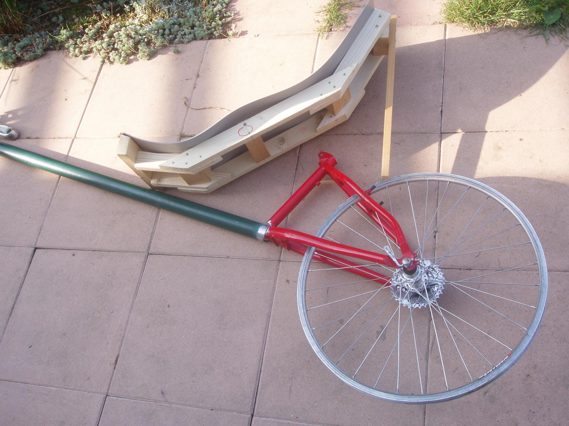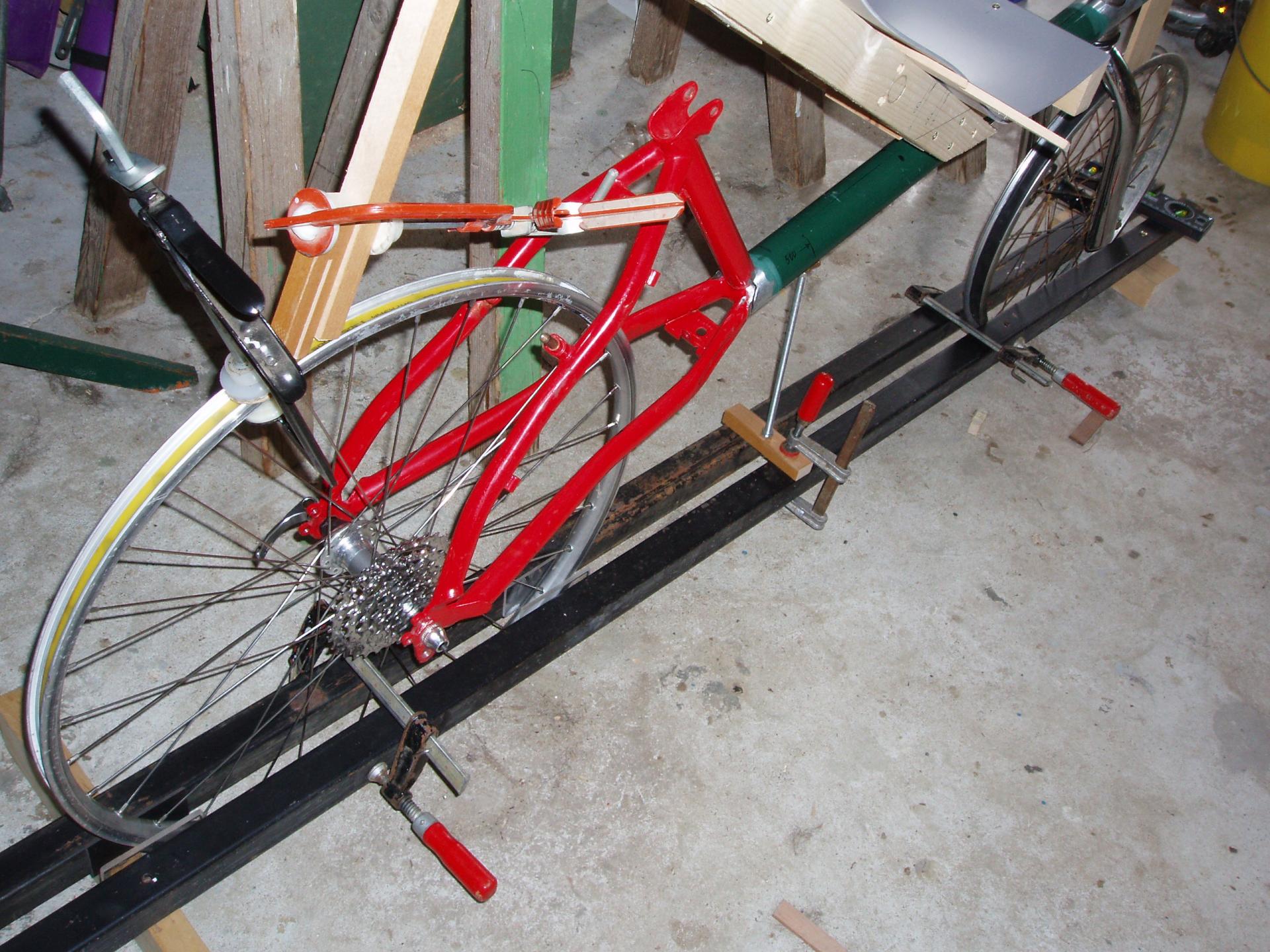 Positionnement des roues et pièces du cadre sur un banc improvisé avant soudures.
